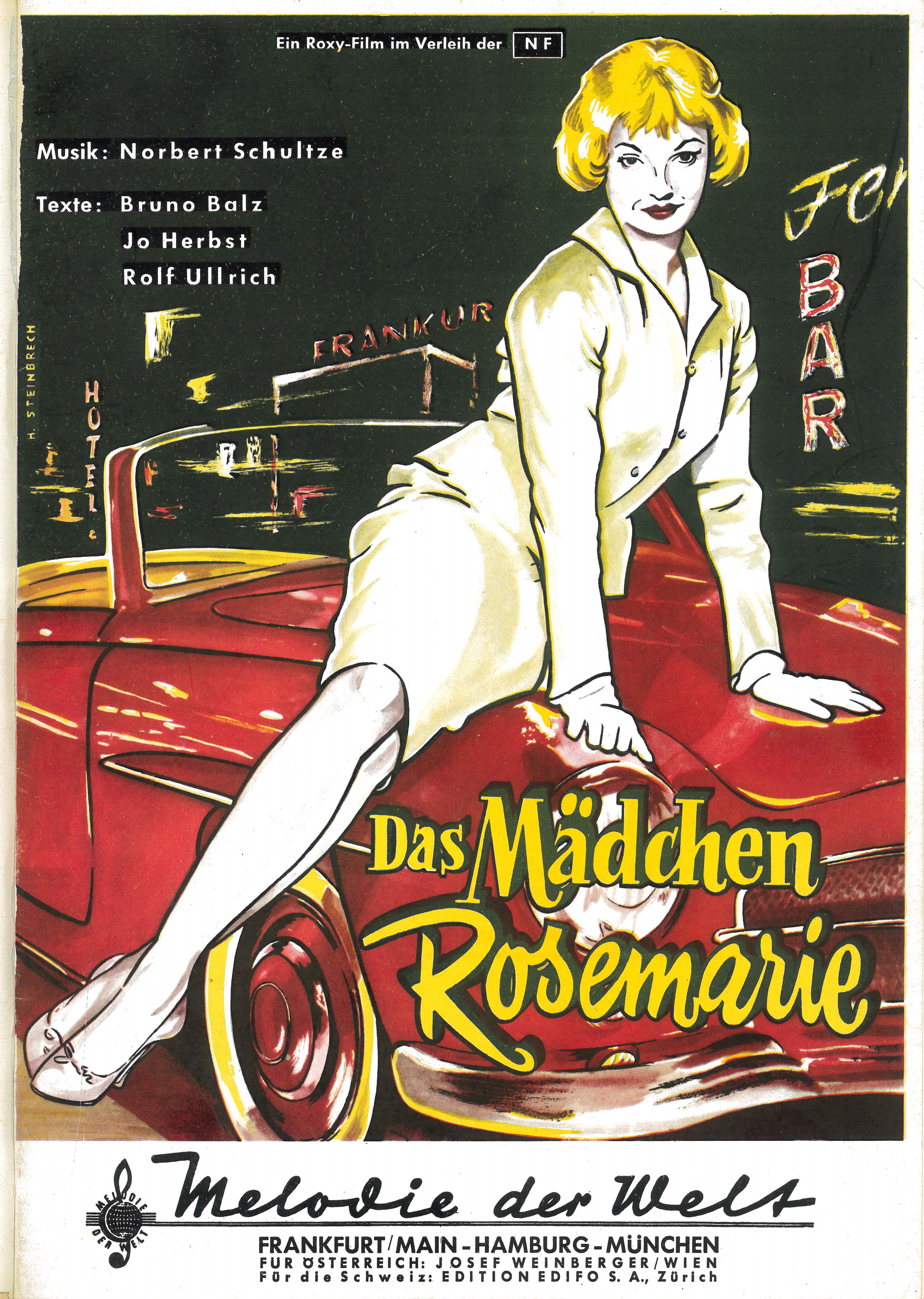 1957 hat Frankfurt einen handfesten Skandal. Die stadtbekannte Edelprostituierte Rosemarie Nitribitt wird ermordet. Der Fall ist bis heute ungeklärt. Diese Geschichte dient ein Jahr später als Inspiration für einen der umstrittensten, aber auch erfolgreichsten Kinofilme der Zeit „Das Mädchen Rosemarie“, mit Nadja Tiller in der Hauptrolle. Die Filmmusik schreibt Norbert Schultze, die oft satirischen Texte stammen von Bruno Balz, Jo Herbst und Rolf Ullrich.